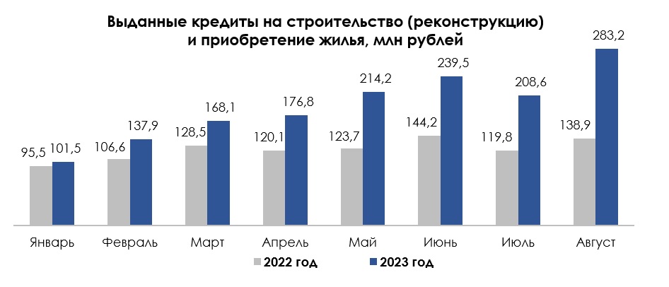 Подспорьем для активности рынка квартир по-прежнему служат комфортные условия кредитования недвижимости, что подтверждается объемами выданных кредитов и их динамикой. По информации Национального банка Республики Беларусь, приведенной в статистическом бюллетене, в августе кредитов на строительство (реконструкцию) и приобретение жилья было выдано на рекордную за текущий год сумму – 283,2 млн рублей, что в два раза больше, чем в аналогичном периоде 2022 года.