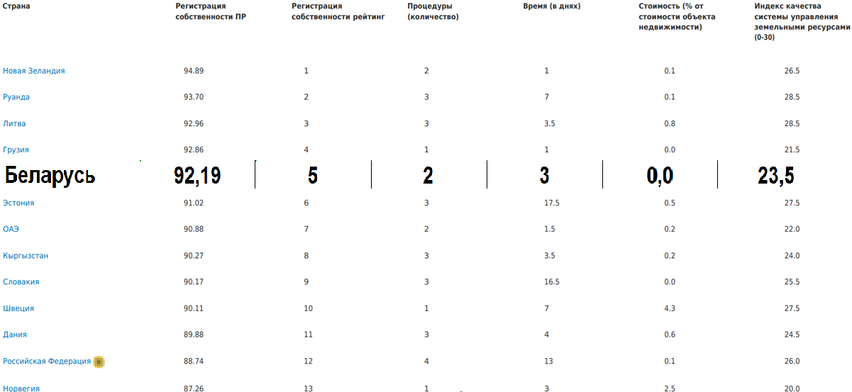 У адпаведнасці са справаздачай Сусветнага банка ”Вядзенне бізнесу – 2019“ па паказчыку ”Рэгістрацыя ўласнасці“, які курыруецца Дзяржаўным камітэтам па маёмасці Рэспублікі Беларусь, Рэспубліка Беларусь займае 5 месца з 190 краін (працэдуры – 2; тэрмін – 3 дні; кошт – 0,0 % ад кошту аб'екта нерухомай маёмасці; індэкс якасці зямельнага адміністравання – 23,5 бала).