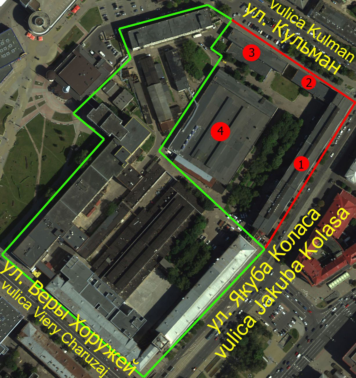 As for the further use of the site within the boundaries of Kulman, Yakub Kolas, Vera Khoruzhey streets (highlighted in the upper photo as green), it has already been determined: the buildings on it are planned to be used for high-tech and science-intensive production, trade, as well as for entertainment and administrative- Business purpose.