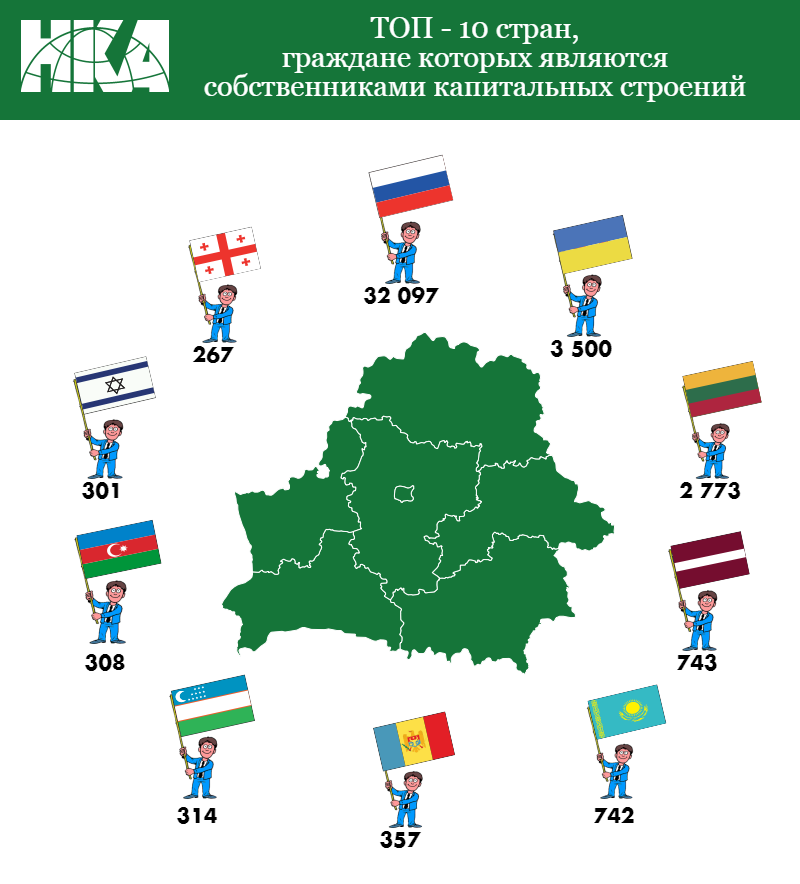 A dozen countries whose citizens own capital buildings on the territory of the Republic of Belarus (by the number of capital structures and their total area) are as follows: Russian Federation 32 097 - 2 358 462 m²; Republic of Ukraine 3,500 - 214,877 m²; The Republic of Lithuania 2773 - 195 605 m²; The Republic of Latvia 743 - 50 239 m²; Republic of Kazakhstan 742 - 68 127 m²; Republic of Moldova 357 - 23 286 m²; Republic of Uzbekistan 314 - 18 602 m²; Republic of Azerbaijan 308 - 34 874 m²; State of Israel 301 - 34 925 m²; The Republic of Georgia is 267 - 16,353 m². By designation, the largest number of capital buildings belongs to the category of "residential": it is more than 34 thousand real estate objects, the total area of which is more than 2 million 399 thousand square meters.