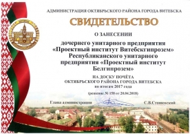По итогам 2017 года Витебское агентство по госрегистрации и земельному кадастру занесено на городскую доску Почета, а Проектный институт «Витебскгипрозем» – на доску Почёта Октябрьского района областного центра.