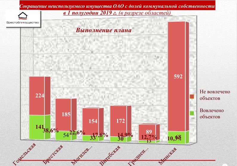 Выполнение плана вовлечения в хозяйственный оборот и сноса неиспользуемого имущества коммунальной собственности Брестской области и ее административно-территориальных единиц составляет 30,7% (при среднереспубликанском показателе – 24%). Всего из 238 запланированных объектов вовлечен 61 объект, в том числе, путем:
