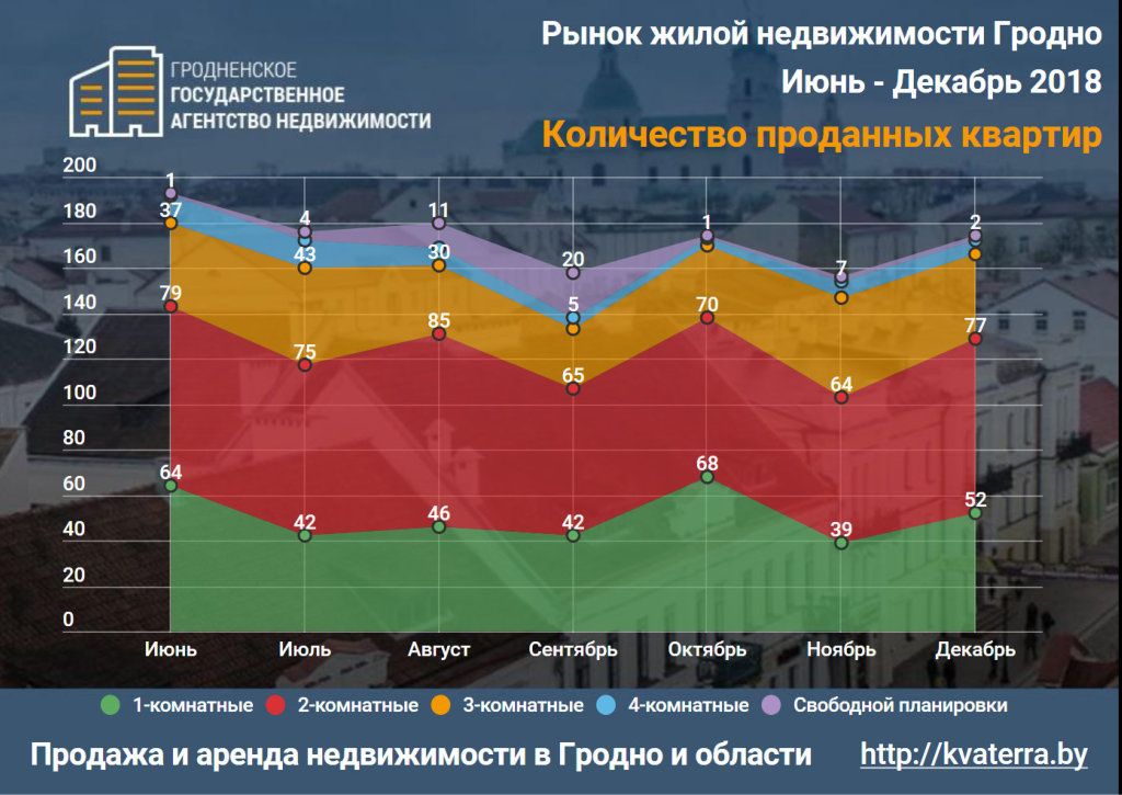 Согласно данным обзора состоявшихся в декабре 2018 года сделок с жилыми помещениями в Гродно, подготовленного специалистами дочернего предприятия «Гродненское агентство по оказанию риэлтерских услуг», в последнем месяце ушедшего года в областном центре было продано 174 квартиры. 74% сделок здесь пришлись на вторичный рынок, а 26% – сделки с застройщиками или их посредниками.