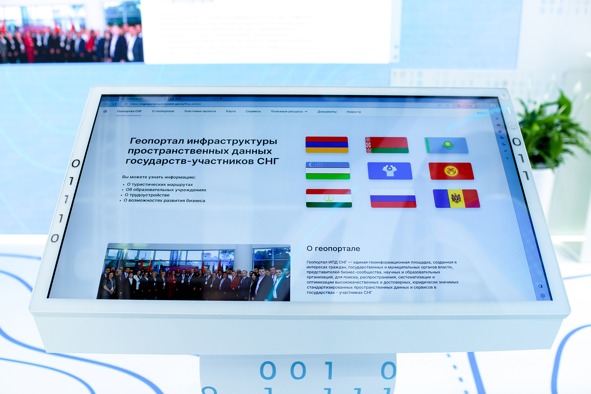 В числе участников выставки – Федеральная служба государственной регистрации, кадастра и картографии (Росреестр). Главный экспонат стенда ведомства – электронная информационная стойка, на которой запущен прототип Геопортала инфраструктуры пространственных данных государств – участников СНГ. Это первый проект, объединяющий межгосударственные пространственные данные стран Содружества на единой, полностью независимой от программного обеспечения недружественных стран цифровой платформе.