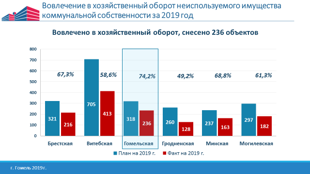 Всего в соответствии с календарными графиками вовлечения в хозоборот, сноса неиспользуемого и неэффективно используемого имущества Гомельской области было вовлечено в хозяйственный оборот, снесено 236 объектов коммунальной собственности или 74,2% (при среднереспубликанском показателе 62,6%). В том числе было продано 67 объектов, используется для собственных целей – 54, сдано в аренду – 38, передано в частную и республиканскую собственность, а также в пределах коммунальной собственности – 6, снесен 71 объект.