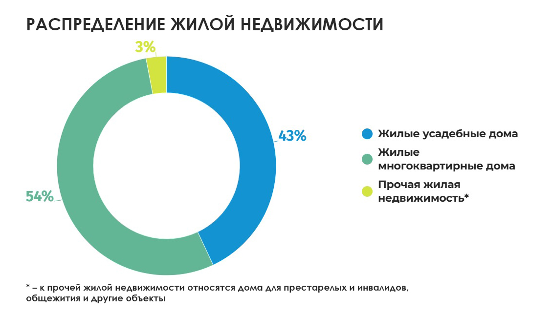 Среди жилой недвижимости с незначительным превышением преобладают квартиры в многоквартирных домах. Они составляют 54% от общей площади зарегистрированных объектов (168 домов). Жилые усадебные дома составляют 43% (1 818 домов).