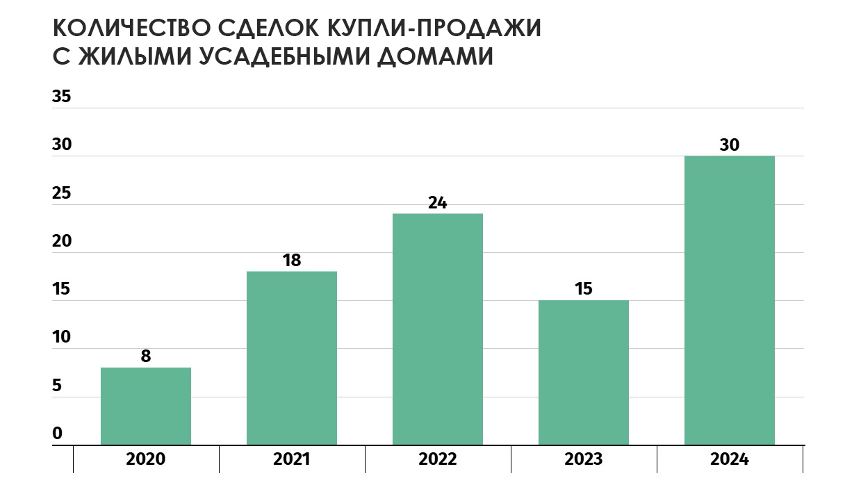 В период 2020-2024 годов совершено 95 сделок с жилыми усадебными домами (от 8 до 30 сделок в год). Примечательно, что 41% сделок был совершен с домами площадью более 100 кв.м, преимущественная часть из них имеет возраст не старше 20 лет.