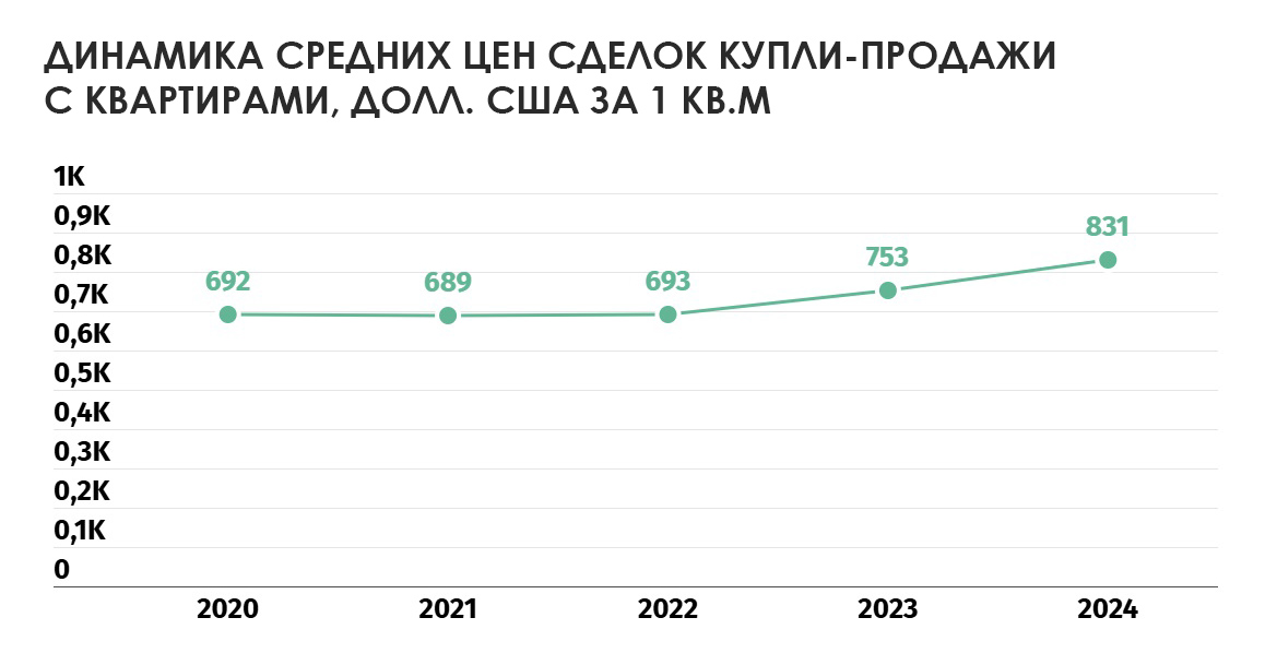 В анализируемом периоде сделки совершались преимущественно с квартирами на вторичном рынке. Средняя цена на квартиры с 2020 по 2024 годы находилась в диапазоне от 689 до 831 долларов США в эквиваленте за квадратный метр. Рост цены в 2024 году составил 10% к предыдущему году и 21% к уровню 2020 года.