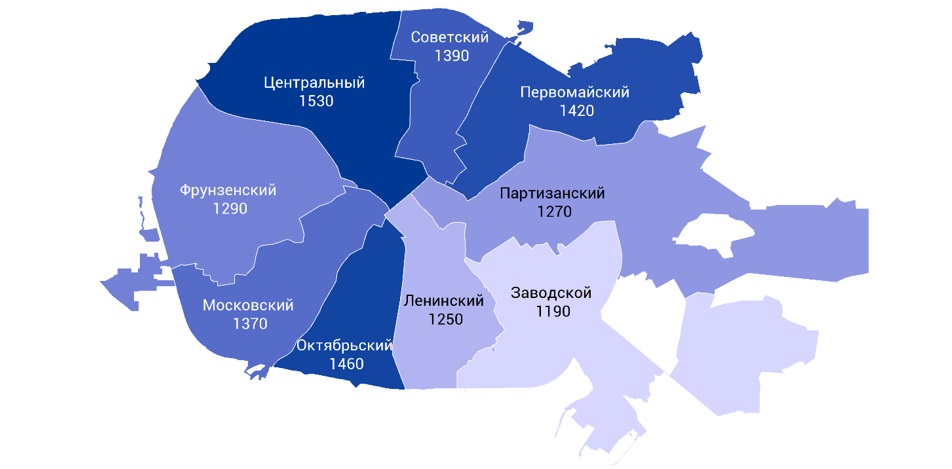 По территориальному признаку лидером в общем количестве сделок стал самый большой район Минска – Фрунзенский. Здесь в течение третьего квартала было совершено 817 сделок. Самый дорогой район Минска – Центральный, где квартиру можно приобрести в среднем за 1 530 долларов США за квадратный метр.