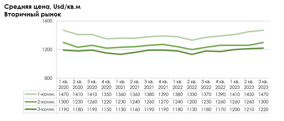 В областных городах средняя цена квадратного метра в долларовом выражении по итогам третьего квартала 2023 года по отношению ко второму кварталу увеличилась в Бресте, Гомеле и Могилеве на 2%, в Витебске – на 3%, в Гродно – не изменилась.