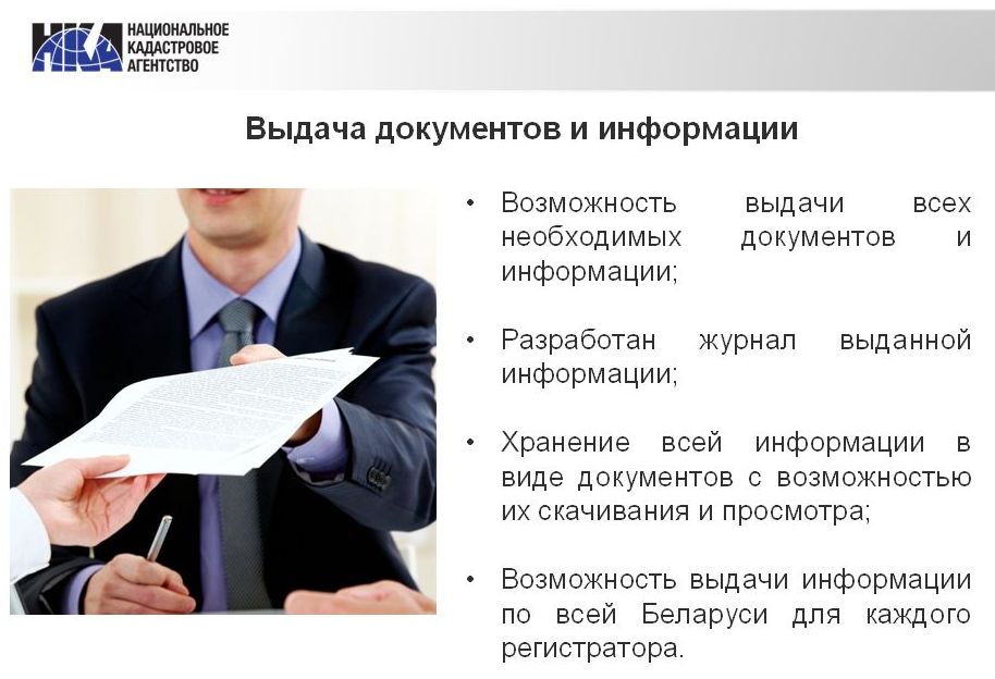 На сегодняшний день в Беларуси в системе государственной регистрации недвижимого имущества уже достигнут достаточно высокий уровень внутренней автоматизации на уровне территориальных организаций по государственной регистрации: созданы системы информирования клиентов в среде интернет, видеонаблюдения, видео и аудио записей приема; системы автоматизация бухгалтерского учета; системы управления заказами, интегрированные с электронными системами управления движения документов бумажных архивов и системами управления качеством, системами контроля поступления денежных средств и смс-оповещения клиентов о выполнении заказа.