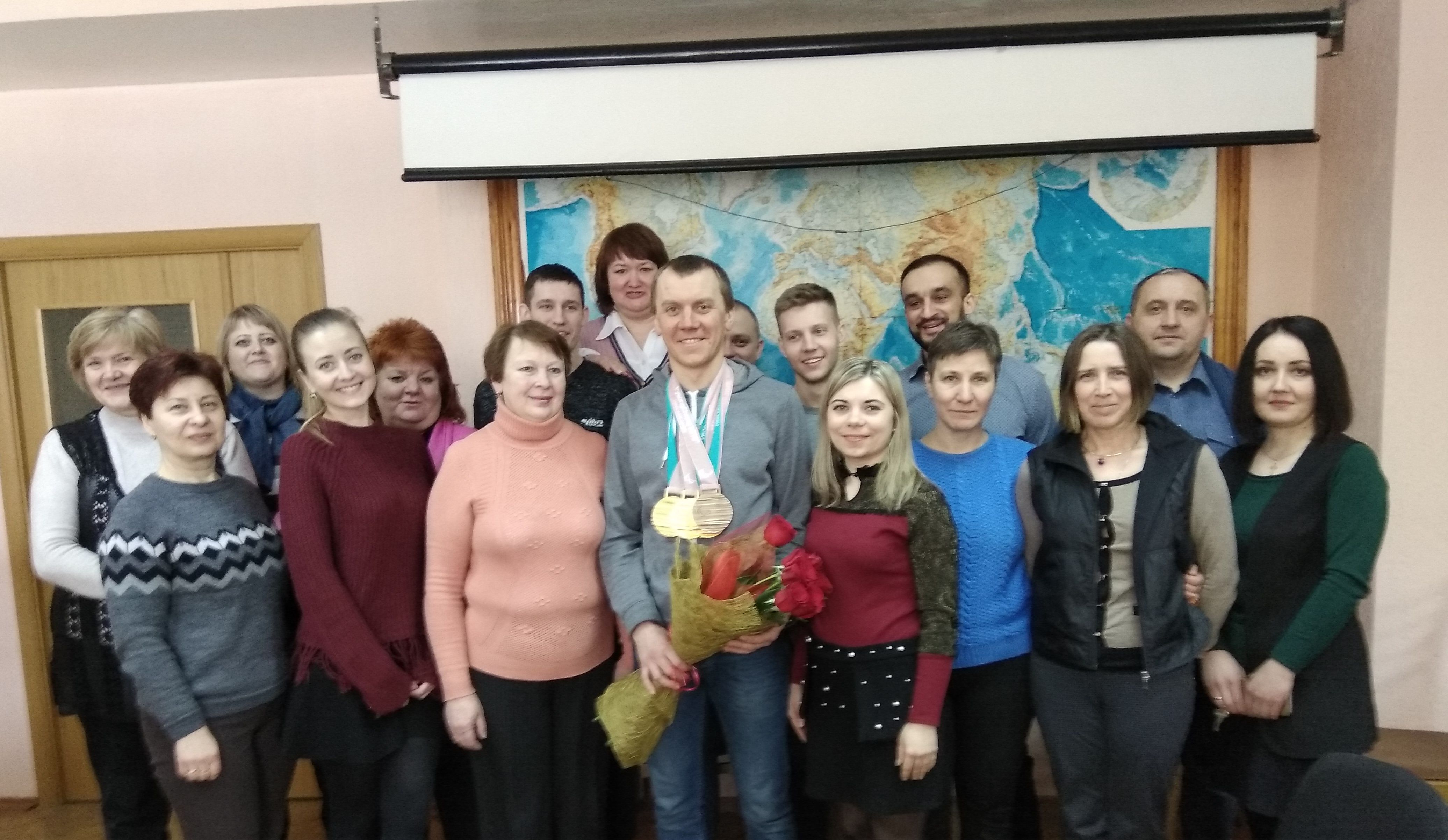 У коллектива государственного предприятия «Белгеодезия» выдался абсолютно необычный трудовой день. Впервые порог предприятия переступил не просто сотрудник, а обладатель трех золотых и одной бронзовой медалей XII зимних Паралимпийских игр в далеком корейском Пхенчхане Роман Ященко – ведущий паралимпийской чемпионки лыжницы Светланы Сахоненко.