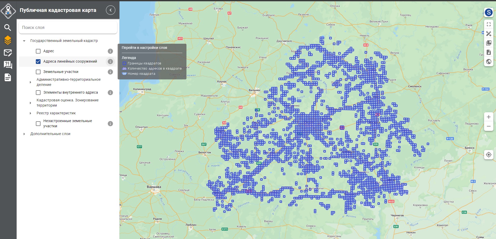 Адреса линейных сооружений стали доступны всем заинтересованным пользователям в открытом доступе на публичной кадастровой карте – разработан и внедрен советующий алгоритм их отображения.