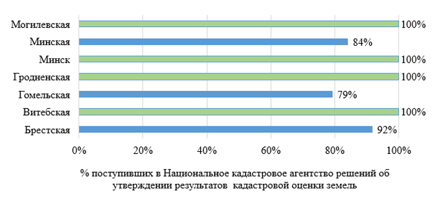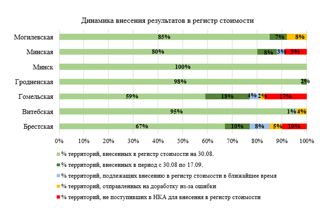 Всего по состоянию на 17 сентября 2018 года для внесения результатов кадастровой оценки земель в регистр стоимости НКА поступило 92 % решений об утверждении результатов кадастровой оценки земель.