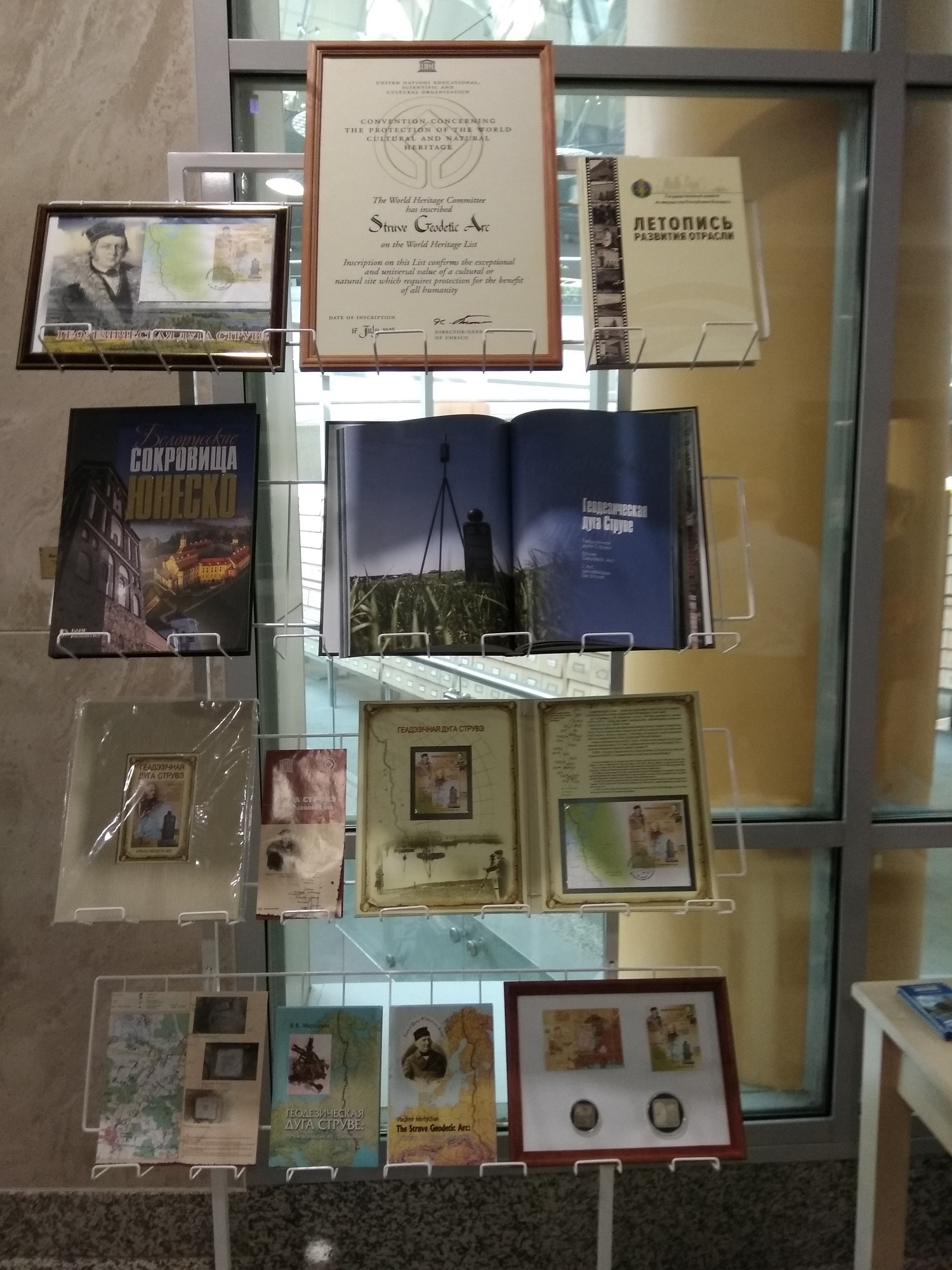 Среди представленных экспонатов книга-альбом «Белорусские сокровища ЮНЕСКО», почтовые марки, выпущенные в 2006 и 2017 годах, памятные монеты 2006 года выпуска, в серебряном и медно-никелевом исполнении достоинством 20 и 1 рубль, соответственно, буклет «Дуга Струве», изданный в 2006 году и книга В.В.Мкртычяна «Геодезическая дуга Струве: путь к всемирному признанию», изданная в 2013 году.