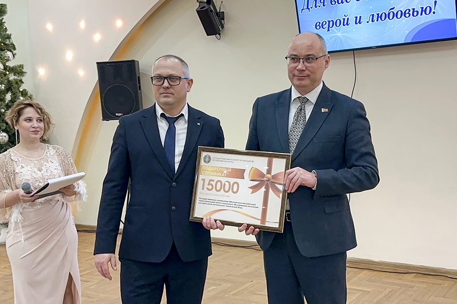 Председатель Госкомимущества также стал участником Рождественского бала, где еще раз поздравил коллектив и посетителей отделения дневного пребывания с новогодними праздниками, а также вручил директору центра Дмитрию Гончару сертификат на Br15 тыс.