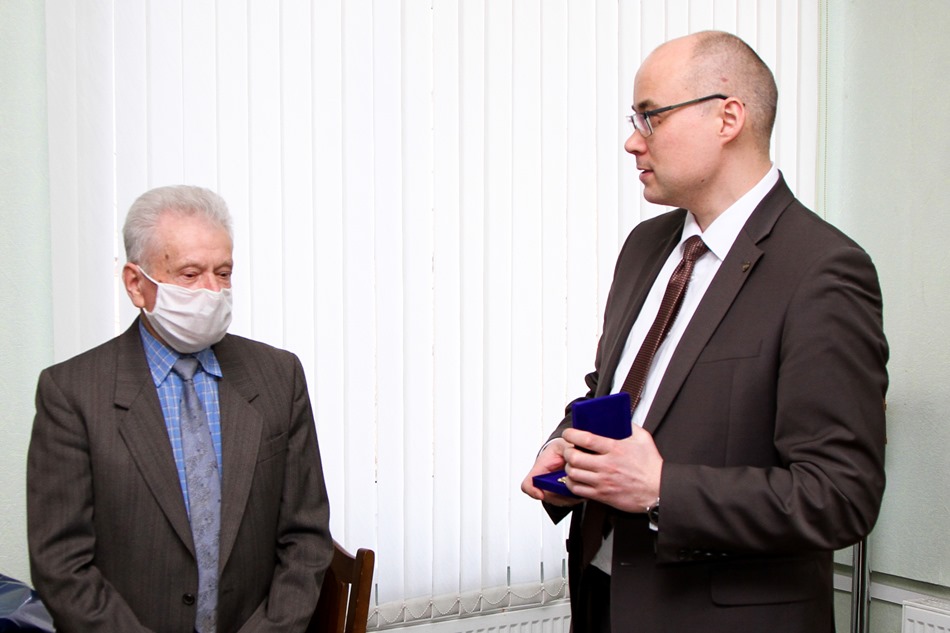 Также глава ведомства вручил нагрудный знак отличия Государственного комитета по имуществу Республики Беларусь «За добрасумленную працу ў сiстэме дзяржмаёмасцi» Ивану Елисеенко – бывшему начальнику производственного отдела землеустроительных и геодезических работ Брестского филиала института «Белгипрозем».