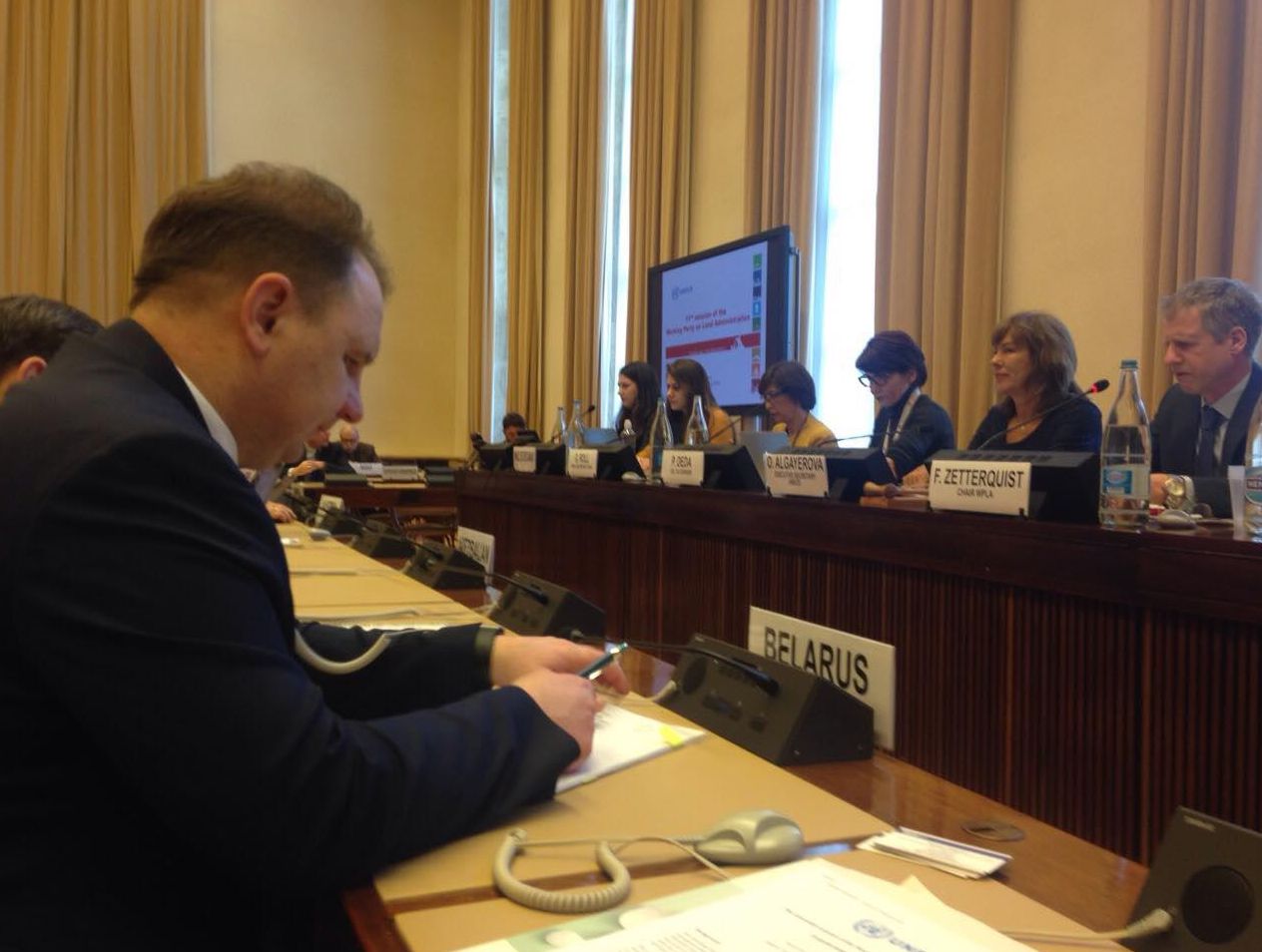 От белорусской стороны  в  работе нынешней сессии Рабочей группы по управлению земельными ресурсами Комитета по жилищному хозяйству и землепользованию Европейской экономической комиссии ООН принимают участие генеральный директор Национального кадастрового агентства Госкомимущества Андрей Филипенко, заместитель генерального директора НКА Денис Жуков и начальник управления геоинформационных систем НКА Марина Литреева.