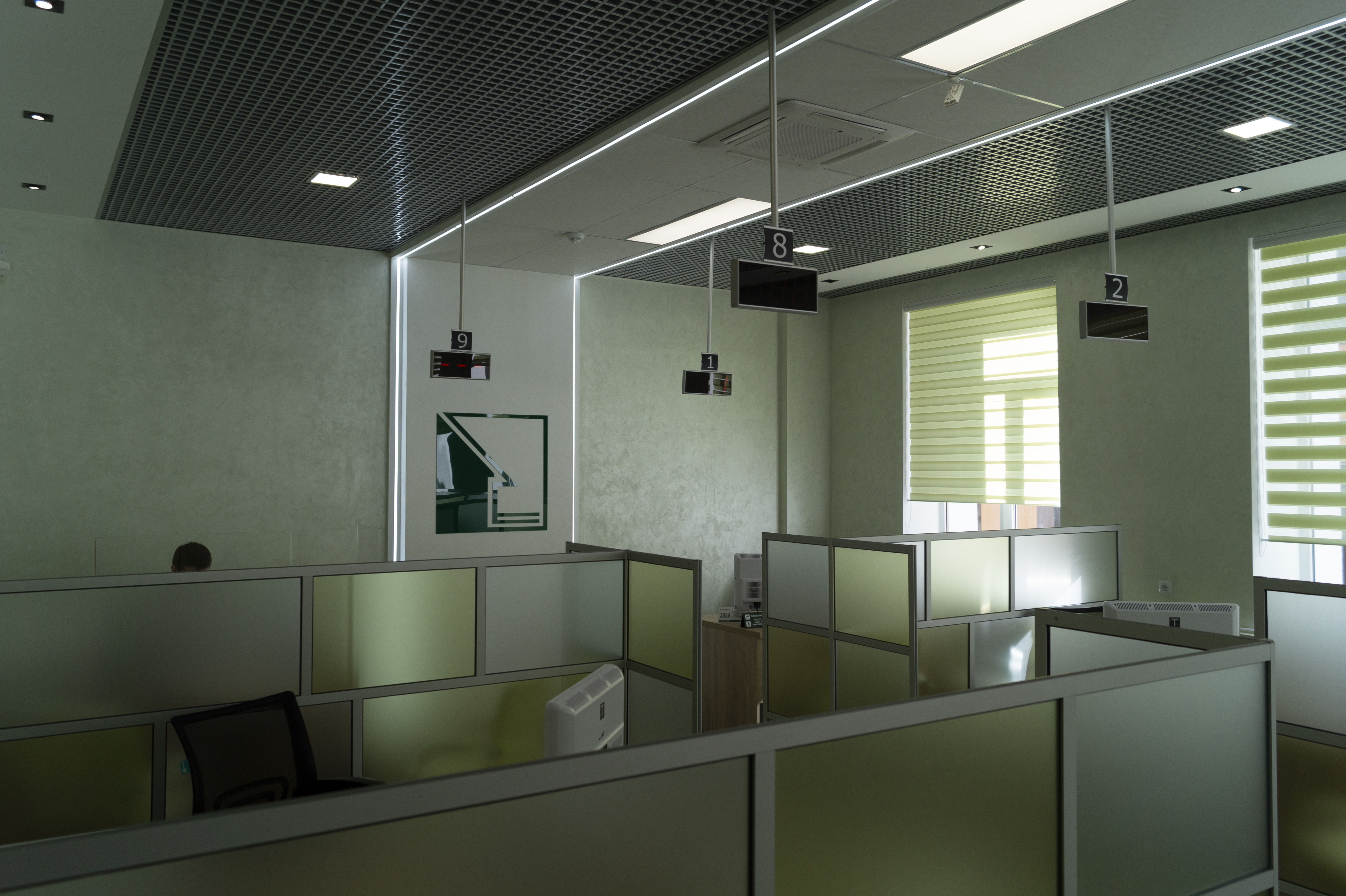 Рабочие места в зале приема граждан и удостоверения договоров зонированы перегородками из закаленного и безопасного стекла.