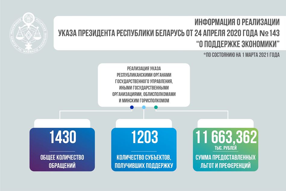 Реализация Указа Президента Республики Беларусь от 24 апреля 2020 года № 143 «О поддержке экономики»