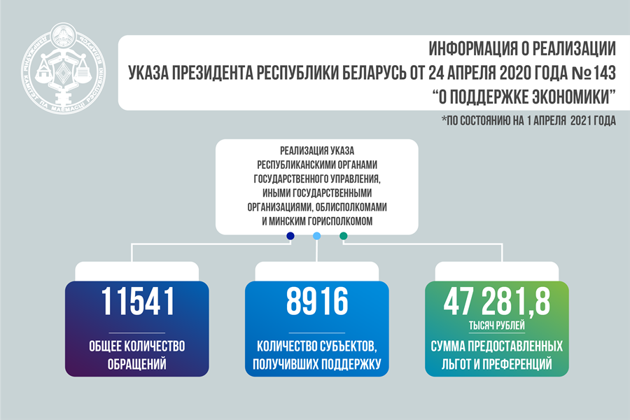 Согласно Указу Президента Республики Беларусь от 24 апреля 2020 г. № 143 «О поддержке экономики» по состоянию на 1 апреля 2021 г. за 1 квартал текущего года оказана поддержка в виде льгот и преференций в отношении арендной платы и рассрочки по приобретенному имуществу 1 567 субъектам хозяйствования на сумму 16 477,287 тысяч рублей.