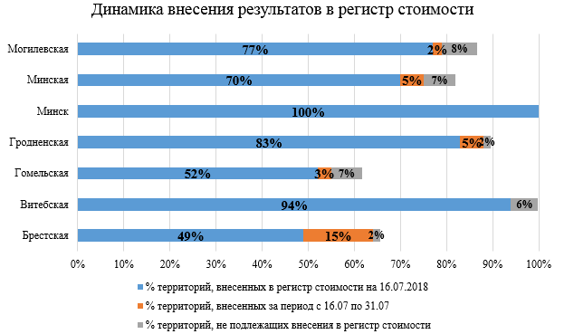 По состоянию на 30 июля 2018 года для внесения результатов кадастровой оценки земель в регистр стоимости в адрес Национального кадастрового агентства поступило 79% решений об утверждении результатов кадастровой оценки земель, в регистр стоимости внесены результаты кадастровой оценки земель по 74% территорий Республики Беларусь.