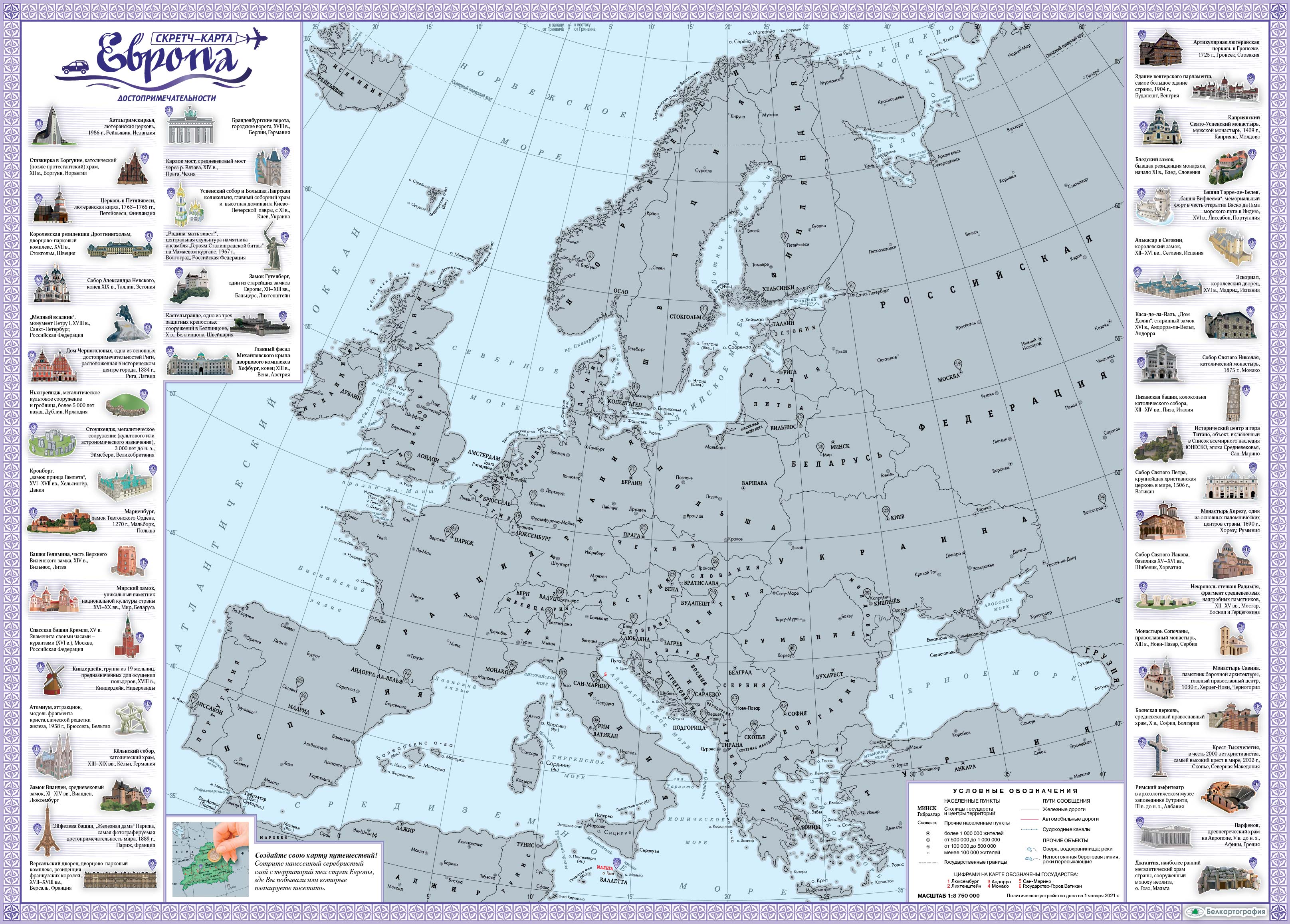 На карте под тонким серебристым слоем, который легко стирается, находится политическая карта Европы с указанием названий стран, столиц, крупных городов, автомобильных и железных дорог, судоходных каналов. Также отдельно на карте отмечены места расположения знаковых и необычных достопримечательностей европейских стран. Их изображения и краткие описания находятся на полях. Масштаб скретч-карты – 1:8 750 000.
