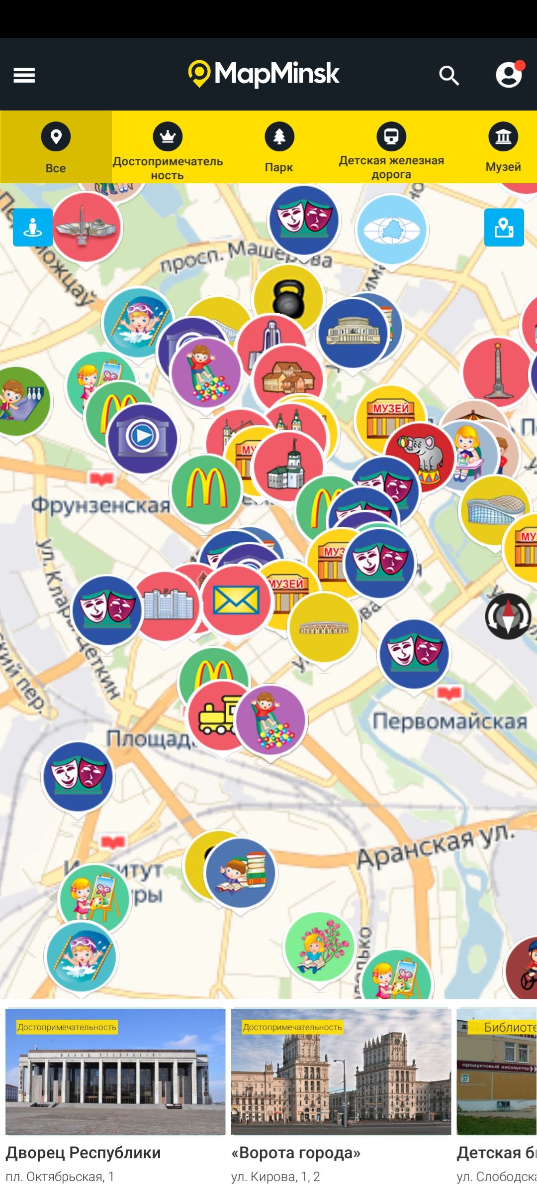 Интерактивная карта MapMinsk («Открой Минск») является своеобразным путеводителем, справочником для детей и их родителей. Путешествуя по карте, можно ознакомиться с основными достопримечательностями города, получить сведения о театрах, музеях, парках, спортивных комплексах и других интересных объектах. На карте показано более 200 объектов, систематизированных по категориям. Карта представлена на трех языках: белорусском, русском, английском.