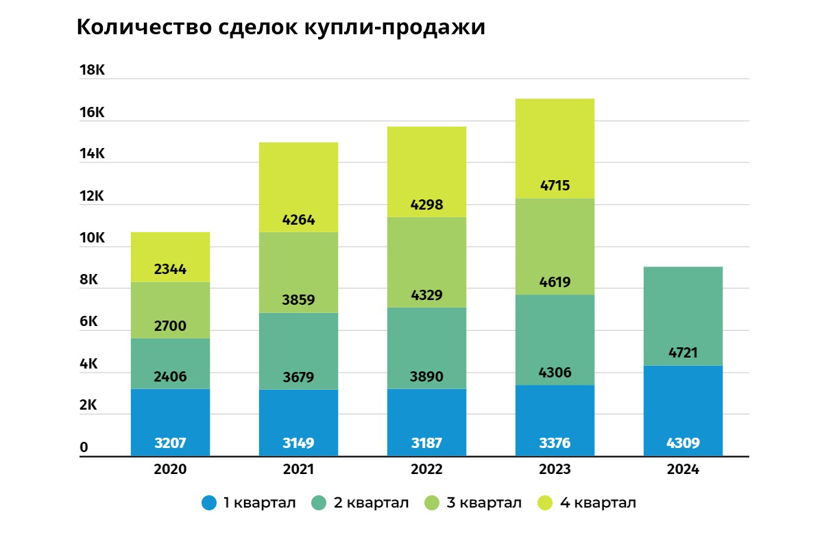Новый максимум по количеству сделок с квартирами с 2016 года установил 2-й квартал 2024 года – 4 721 сделка. Для сравнения за аналогичный период 2023 года было совершено 4 306 сделок, 2022 года – 3 890 сделок. Однокомнатных квартир купили на 14% больше, чем в первом квартале, а двухкомнатных квартир – на 11%, при этом интерес к трехкомнатным и многокомнатным квартирам почти не изменился.