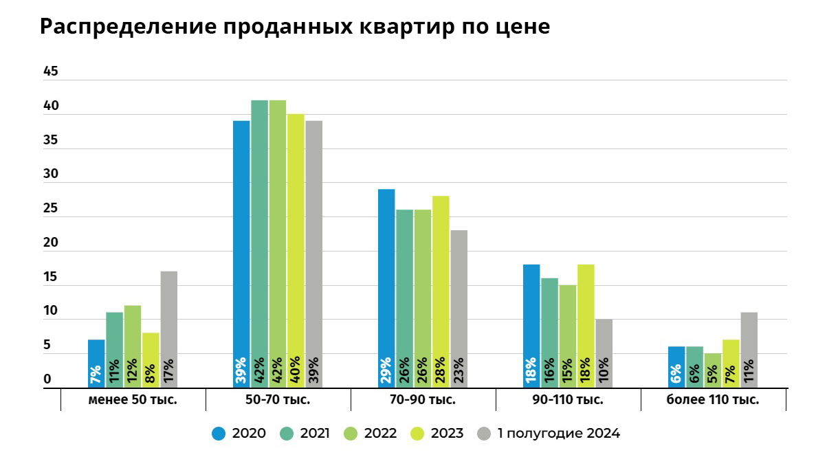 Чаще всего в Минске приобретали квартиры в диапазоне от 50 до 70 тыс. долл. США в экв. – на них приходится 39% от общего числа сделок. По итогам 2-го квартала 2024 года в структуре проданных квартир по цене отмечены сдвиги как в более дешевом диапазоне – до 50 тыс. долл. США в экв., так и в более дорогом – на долю квартир стоимостью свыше 110 тыс. долл. США в экв. пришлось 11% сделок, тогда как в предыдущие три года – в среднем 6%.