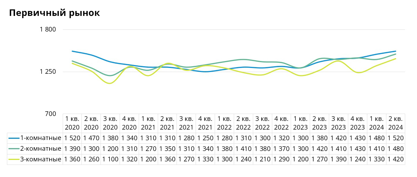 На первичном рынке Минска во 2-м квартале 2024 года по отношению к предыдущему заметнее других подорожали трехкомнатные квартиры – на 7%. Это объясняется структурой рынка – именно в этот период 40% сделок совершено в малоэтажном жилом комплексе на улице Сергея Есенина (микрорайон Малиновка). Трехкомнатные квартиры здесь продавались от 1460 до 1520 долл. США за кв. м, что выше среднерыночного уровня.