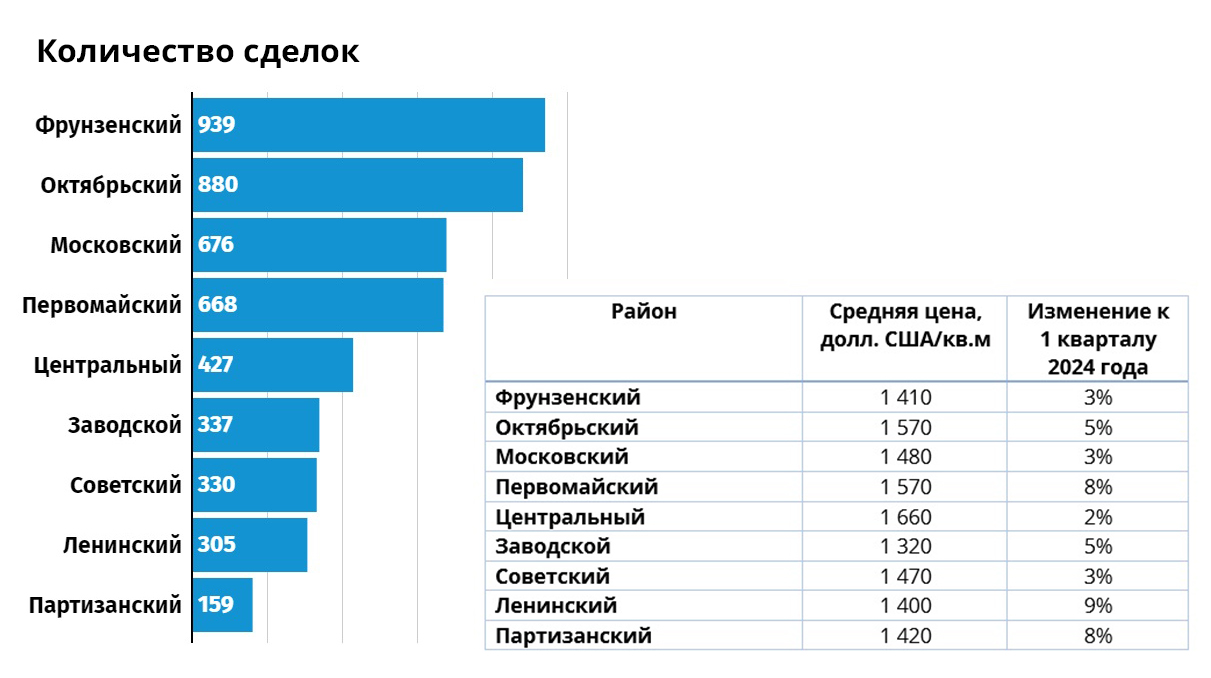 Среди районов чаще других покупатели выбирали Фрунзенский и Октябрьский, реже – Ленинский и Партизанский. Рост количества сделок во 2-м квартале по сравнению с 1-м кварталом – с 489 до 668 – отмечен в Первомайском районе. Треть объема проданных квартир здесь – жилой комплекс у Парка Челюскинцев. Самый дорогой район Минска – Центральный, где квартиру можно приобрести в среднем за 1660 долл. США в экв. за кв. м.