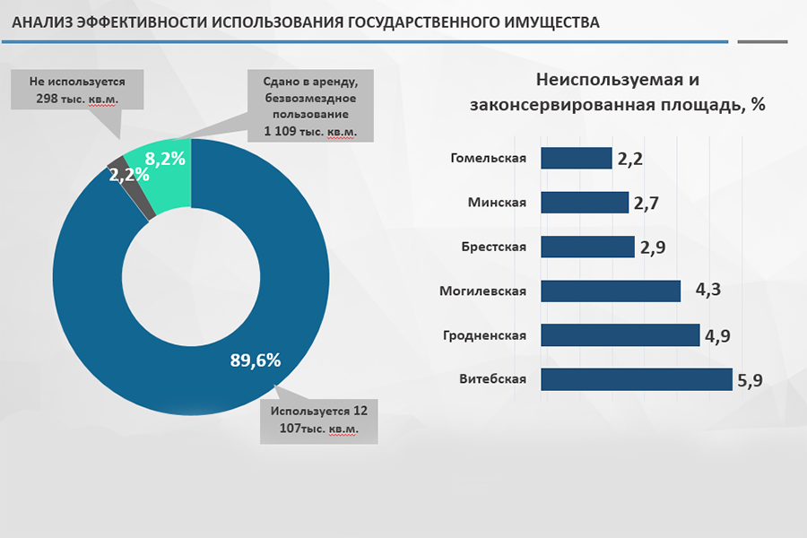 Также по эффективности использования имущества Гомельская область вышла на первое место в стране – удельный вес неиспользуемых площадей самый низкий среди областей.