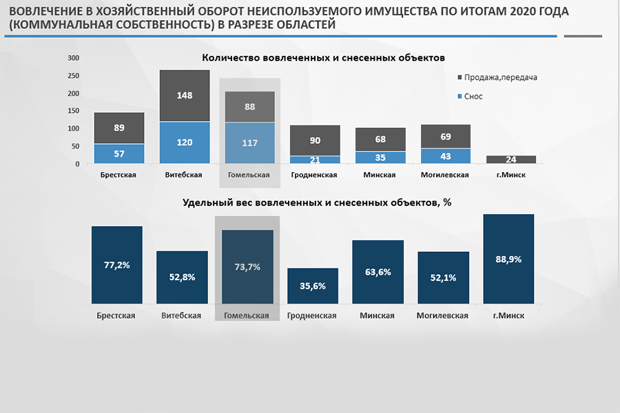 В 2020 году вовлечено в хозяйственный оборот и снесено 252 неиспользуемых объектов коммунальной собственности, из которых 69 – продано.