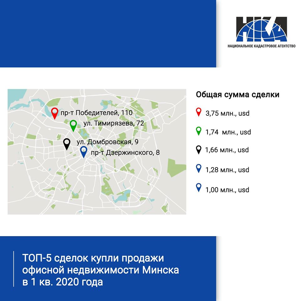 696,7 кв. м по цене 1 833 долларов США за кв. м и общей стоимостью 1, 28 млн долларов США было продано офисное помещение в БЦ по пр-ту Дзержинского, 8;