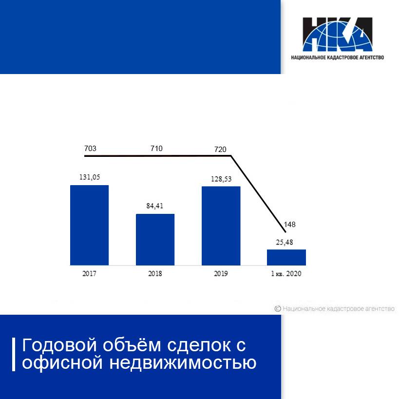 В целом, согласно проведенного специалистами НКА анализа, годовой оборот по сделкам с офисной недвижимостью в Минске в 2019 году сравнялся с уровнем 2017 года и составил 128,53 млн долларов США Количество зарегистрированных сделок за последние три года осталось на одном уровне – в среднем 710 сделок в год.
