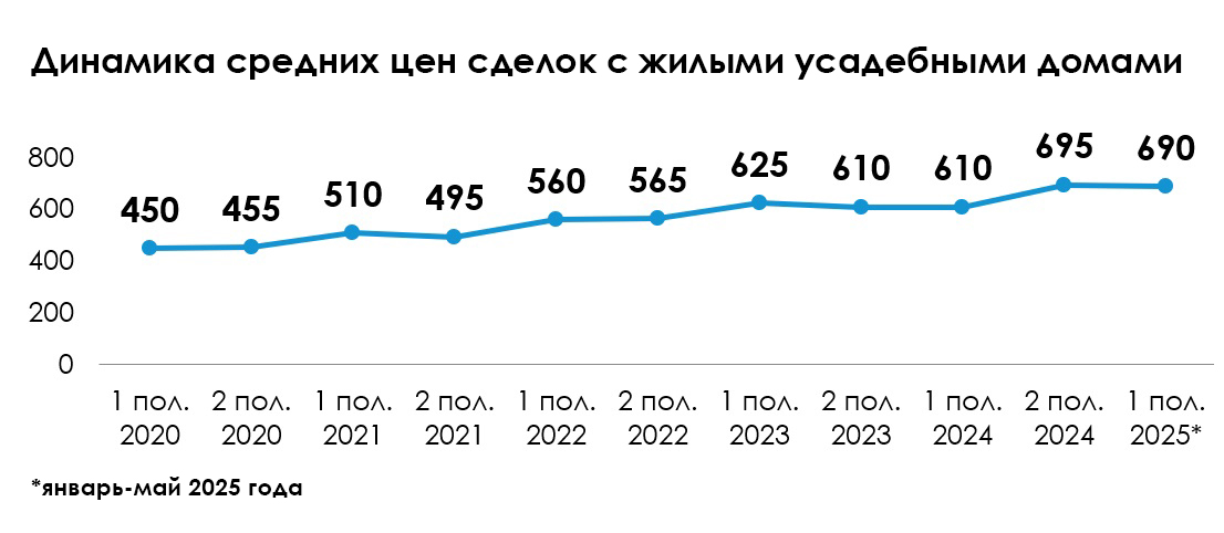 В течение периода анализа средняя цена постепенно увеличивалась и по итогам января-мая 2025 года достигла отметки в 690 долл. США в экв. за квадратный метр.