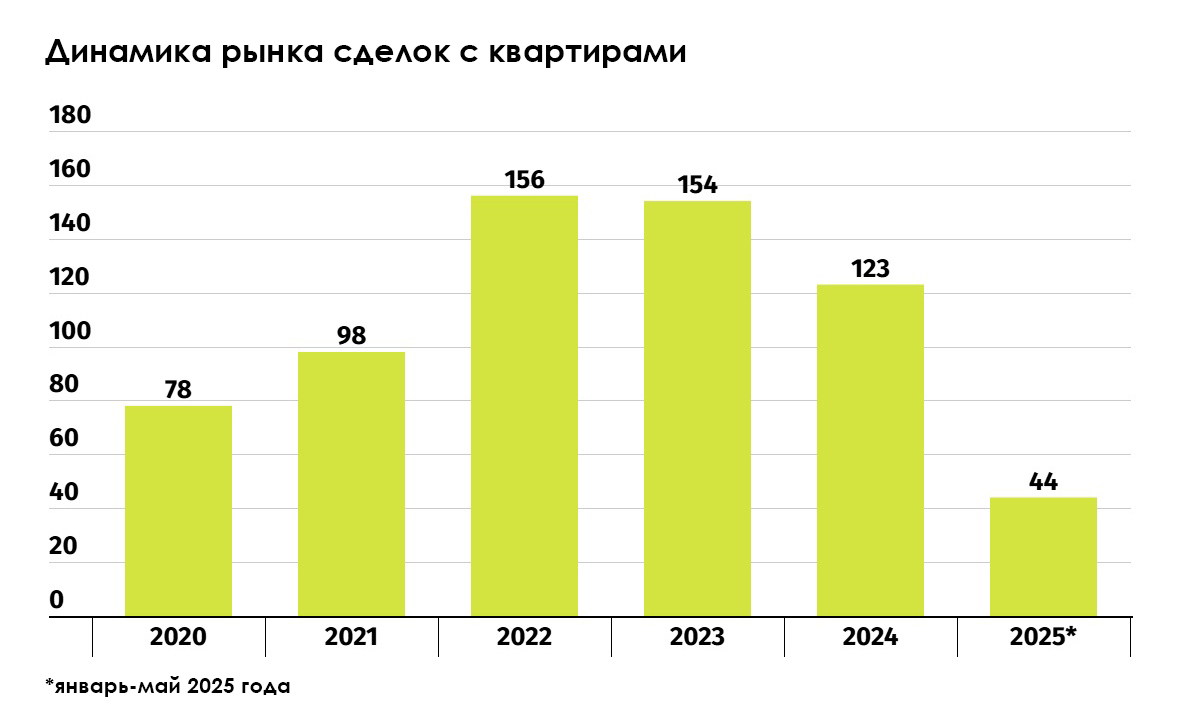 Самая дорогая сделка с квартирой совершена в 2025 году. Трехкомнатная квартира площадью почти 80 кв. м была продана за более чем 80 тыс. долл. США в экв. или 1042 долл. США в экв. за квадратный метр.