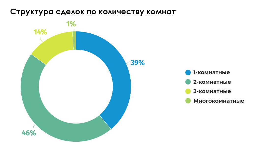 Наиболее востребованными у покупателей стали двухкомнатные квартиры: их доля в общем количестве сделок составила 46%, немного меньше у однокомнатных квартир – 39%. На трехкомнатные квартиры пришлось 14% сделок.