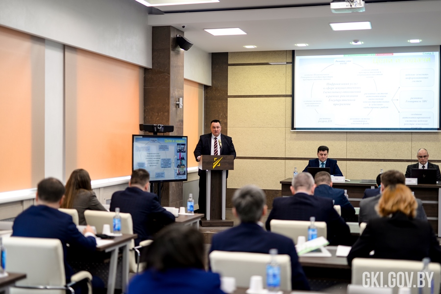 У рамках пасяджэння падагульняючай калегіі з дакладам выйшаў намеснік Старшыні Дзяржкаммаёмасці Мікалай Бобер, які расказаў аб стане і перспектывах развіцця геадэзіі, картаграфіі і землеўпарадкавання ў Рэспубліцы Беларусь.