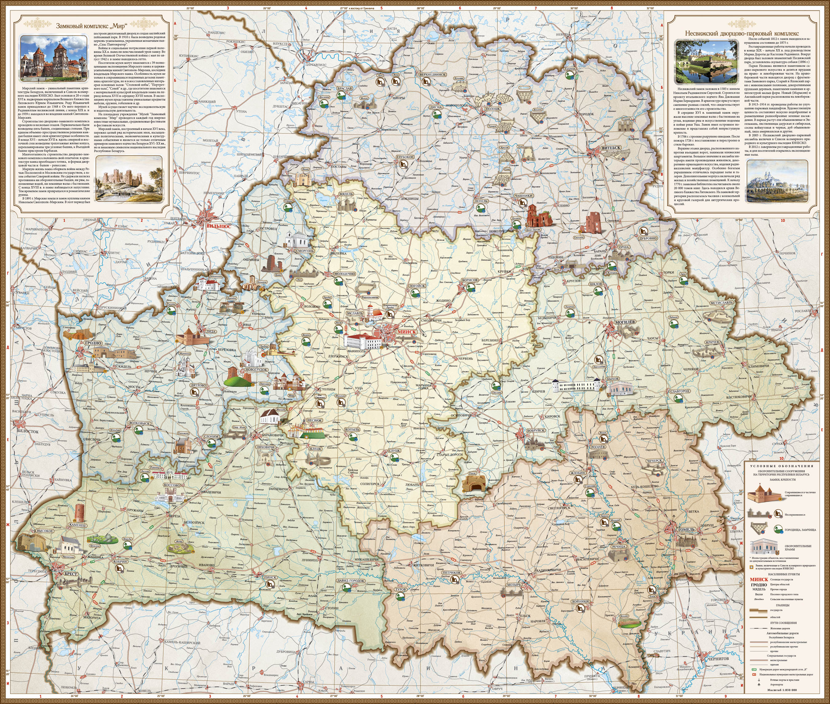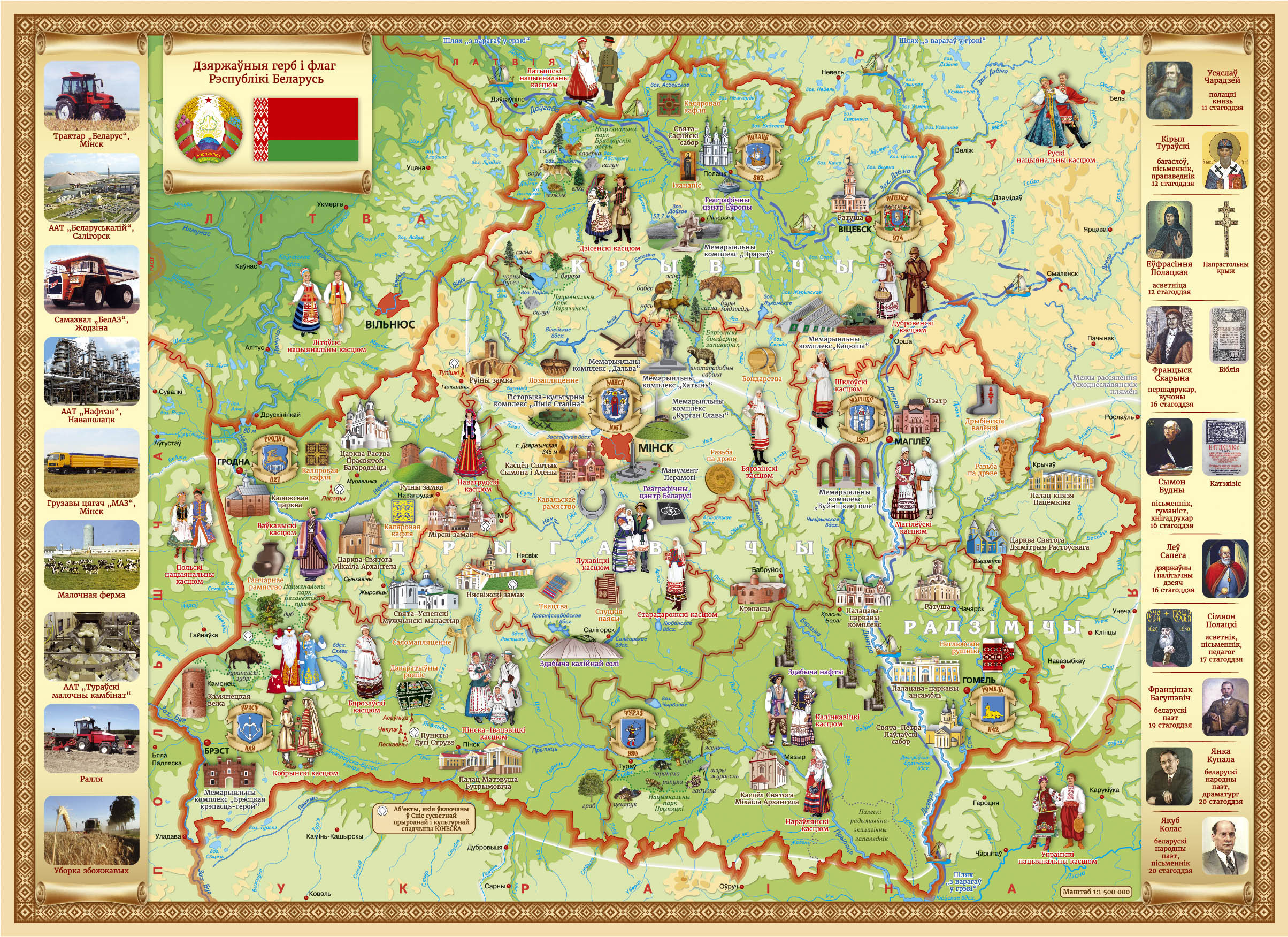 Карта печатается на двух языках: русском и белорусском. С помощью ярких иллюстраций на ней отражены важнейшие архитектурные и природные достопримечательности Республики Беларусь, показаны ареалы расселения белорусских племен, помещена информация о выдающихся деятелях Беларуси, нанесены центры ремесел и другая информация, позволяющая познать свой край.