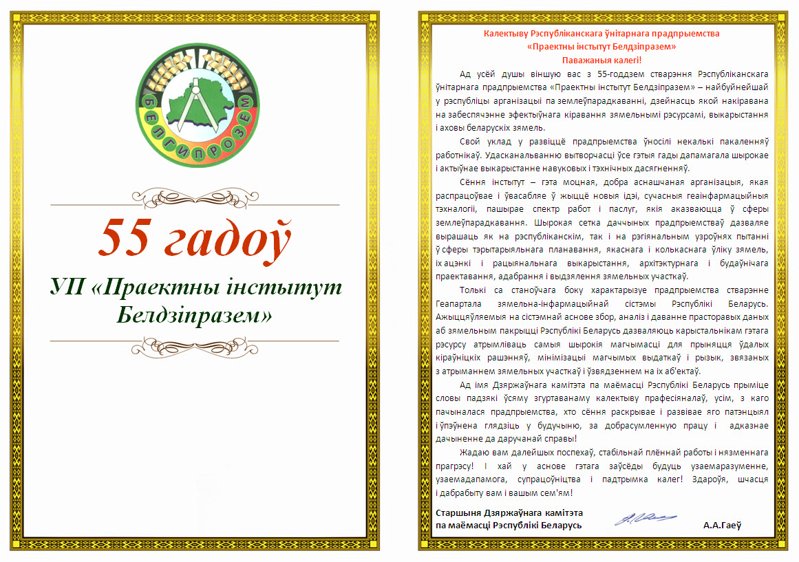 55-летие со дня создания отмечает сегодня Республиканское унитарное предприятие «Проектный институт Белгипрозем» – ведущее предприятие Республики Беларусь в области землеустройства, входящее в систему Государственного комитета по имуществу Республики Беларусь. С юбилейной датой коллектив предприятия поздравил Председатель Госкомимущества Андрей Гаев