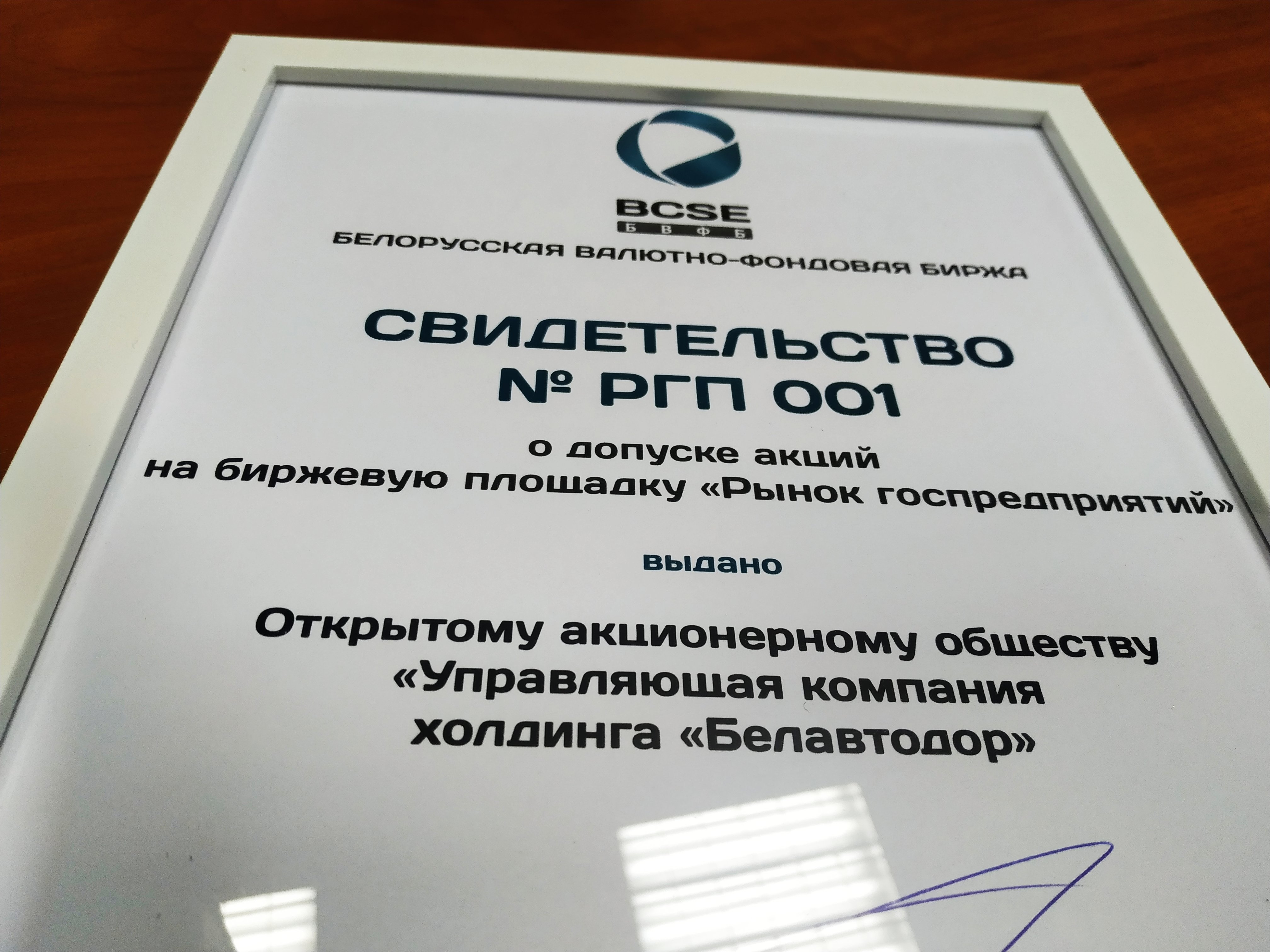 Белавтодор стал первой компанией – акционерным обществом с долей государства в уставном фонде, получившей не формальный, а реальный статус публичной компании благодаря прохождению им процедуры листинга. Ценные бумаги общества, находящиеся в управлении Госкомимуществом, допущены к обращению на площадке «Рынок госпредприятий» со 2 июня 2020 года.