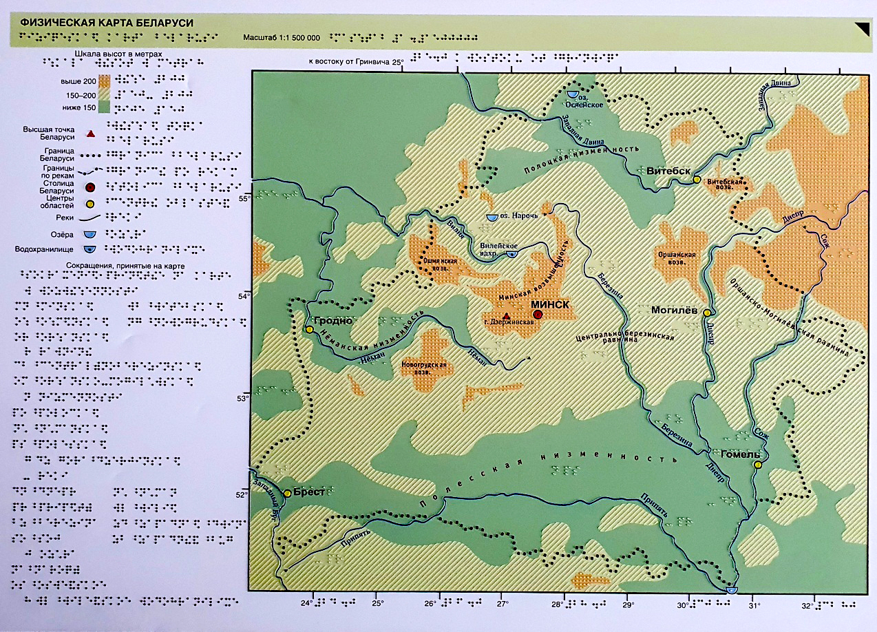 Как отметила Инна Шлык, в «Белкартографии» разработаны технические условия по созданию рельефно-графических пособий для инвалидов по зрению. «Уже созданы экспериментальные произведения: тактильная карта «Республика Беларусь. Физическая карта», масштаба 1:1 500 000, схема «Планеты солнечной системы», ведутся работы по изготовлению других произведений. Названные пособия прошли адаптацию в Минской специальной общеобразовательной школе №188 для детей с нарушением зрения, где им была дана положительная оценка», – поделилась она.