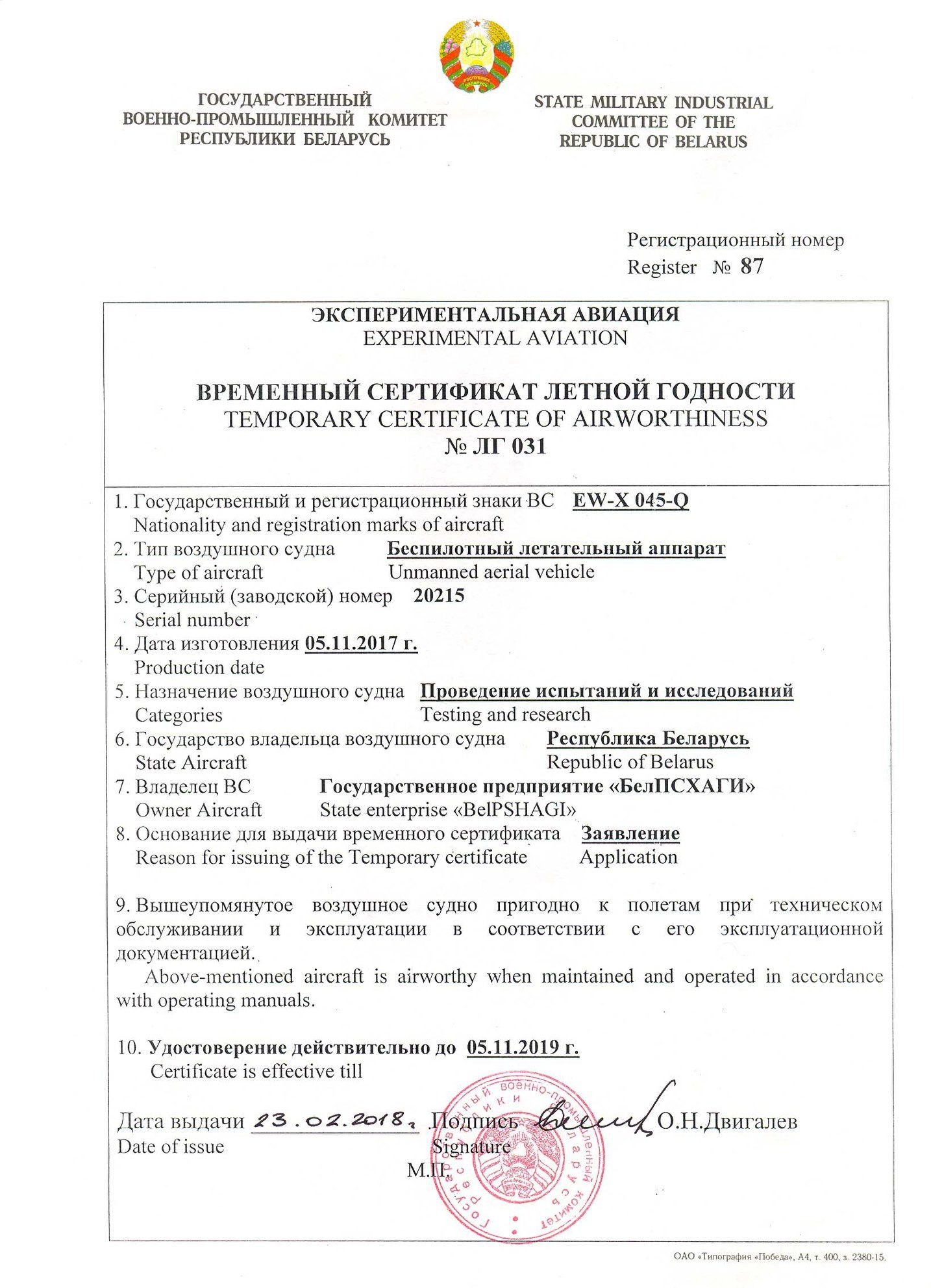 Немногим ранее «БелПСХАГИ» завершило процедуру регистрации беспилотного летательного аппарата в Государственном военно-промышленном комитете Республики Беларусь. Воздушное судно внесено в Государственный реестр экспериментальных воздушных судов Республики Беларусь в соответствии с Воздушным кодексом Республики Беларусь. Ему присвоен Государственный регистрационный номер EW-X 045-Q.