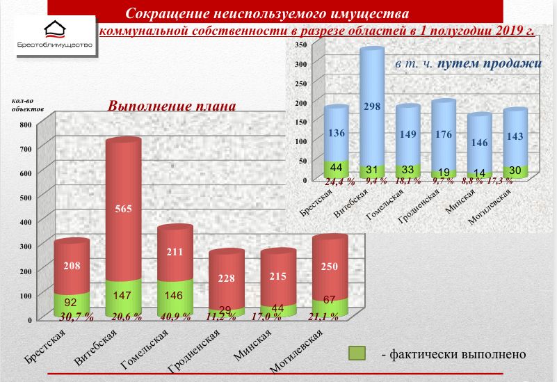 Выполнение плана вовлечения в хозяйственный оборот и сноса неиспользуемого имущества коммунальной собственности Брестской области и ее административно-территориальных единиц составляет 30,7% (при среднереспубликанском показателе – 24%). Всего из 238 запланированных объектов вовлечен 61 объект, в том числе, путем: