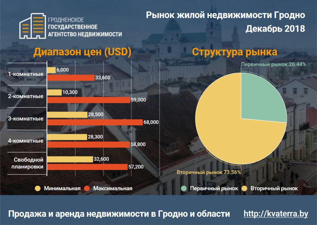 Согласно данным обзора состоявшихся в декабре 2018 года сделок с жилыми помещениями в Гродно, подготовленного специалистами дочернего предприятия «Гродненское агентство по оказанию риэлтерских услуг», в последнем месяце ушедшего года в областном центре было продано 174 квартиры. 74% сделок здесь пришлись на вторичный рынок, а 26% – сделки с застройщиками или их посредниками.