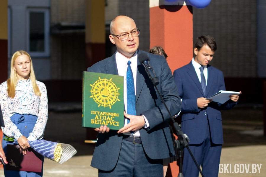 Председатель комитета также констатировал, что Государственный комитет по имуществу на постоянной основе работает с Министерством образования по подготовке картографической продукции: атласов, контурных карт и пособий. «Госкомимущество, помимо прочего, ведет и культурно-просветительскую работу. Поэтому позвольте вручить школе настенную карту «Мая Радзіма – Беларусь» и «Гістарычны атлас Беларусі». Издания ознакомят вас с природными и культурными достопримечательностями Беларуси и откроют новые страницы истории нашей родной страны», – добавил Дмитрий Матусевич.