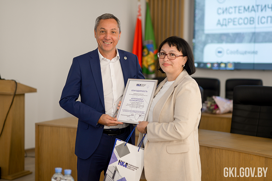 Екатерина Лукьянова также вручила Благодарность Председателя Государственного комитета по имуществу начальнику сектора адресации и обработки информации управления «Кадастр» Витебского агентства по государственной регистрации и земельному кадастру Елене Грубенко, которая была отмечена за высокий профессионализм и вклад в развитие адресной системы Республики Беларусь, а также активное участие в проекте по систематическому присвоению адресов.