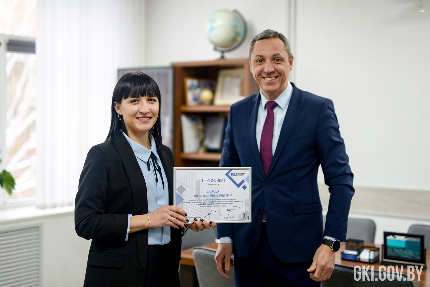 Реестр адресов Республики Беларусь пополнился 7-миллионным актуальным адресом объекта недвижимости, который внесен в отношении квартиры в г.Молодечно. Генеральный директор Национального кадастрового агентства Михаил Хиль вручил сегодня соответствующий сертификат специалисту по технической инвентаризации Молодечненского филиала Минского областного агентства по госрегистрации и земельному кадастру Анастасии Дюковой.